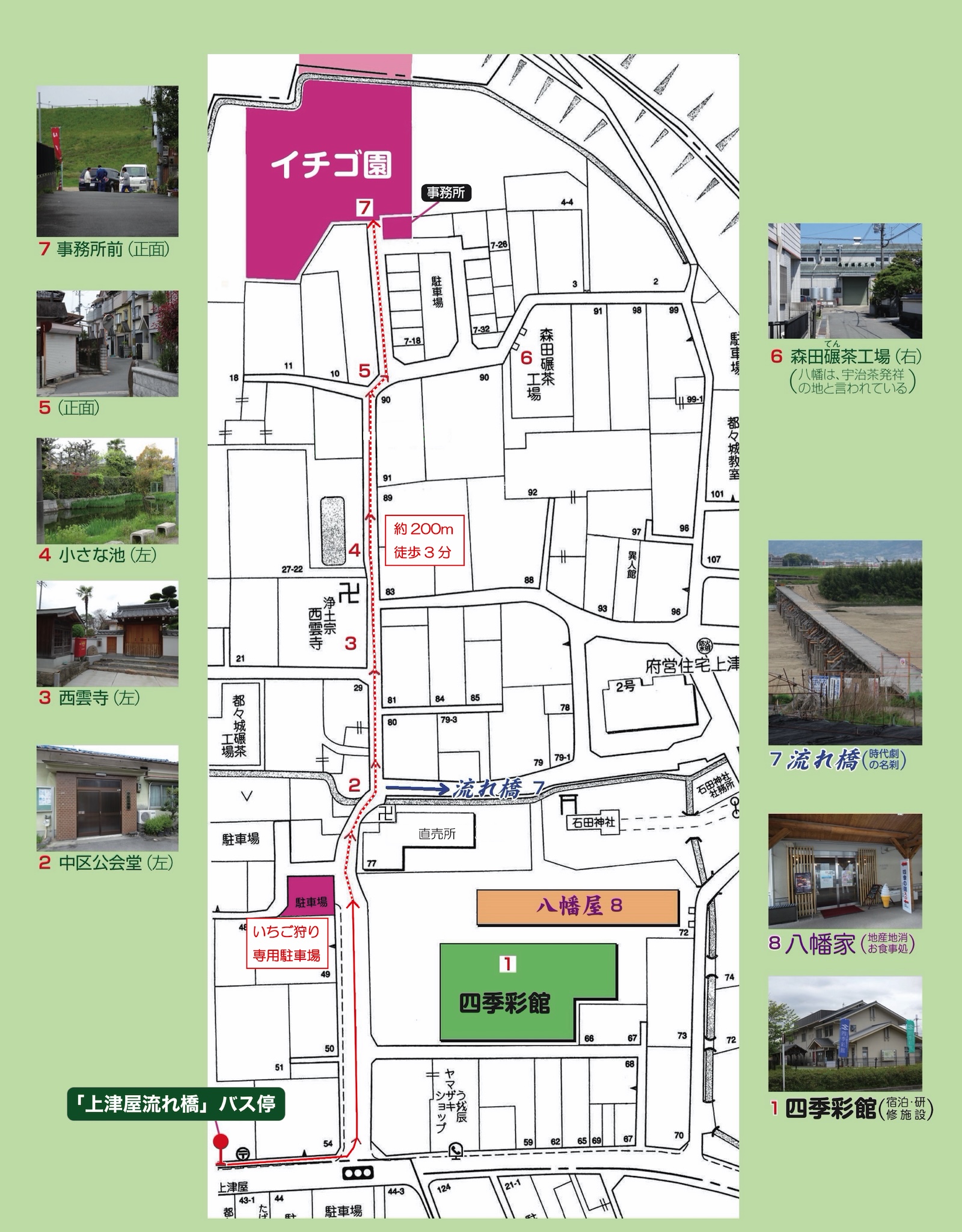 「上津屋流れ橋」バス停からいちご園までの徒歩で行く地図(徒歩4分)
